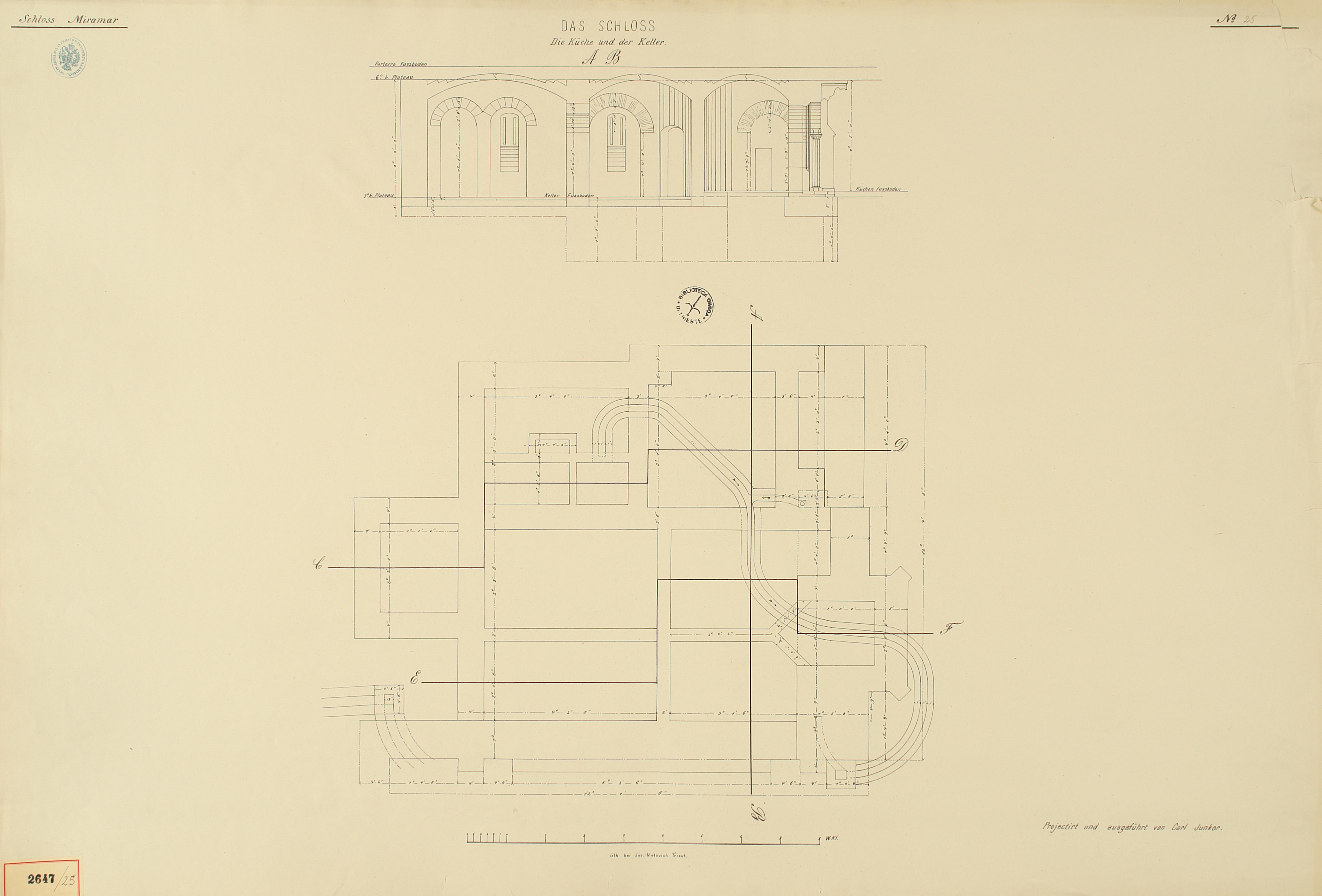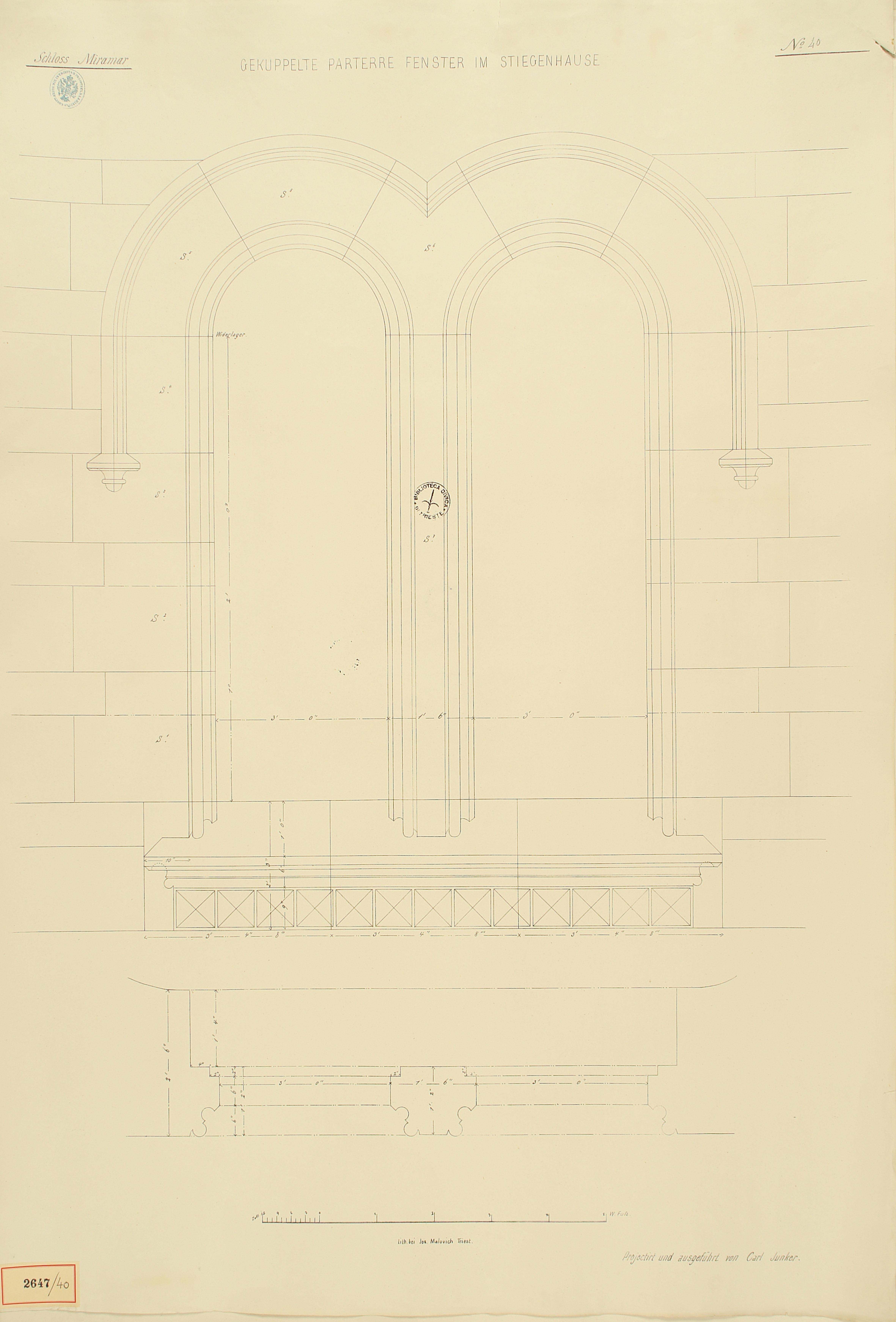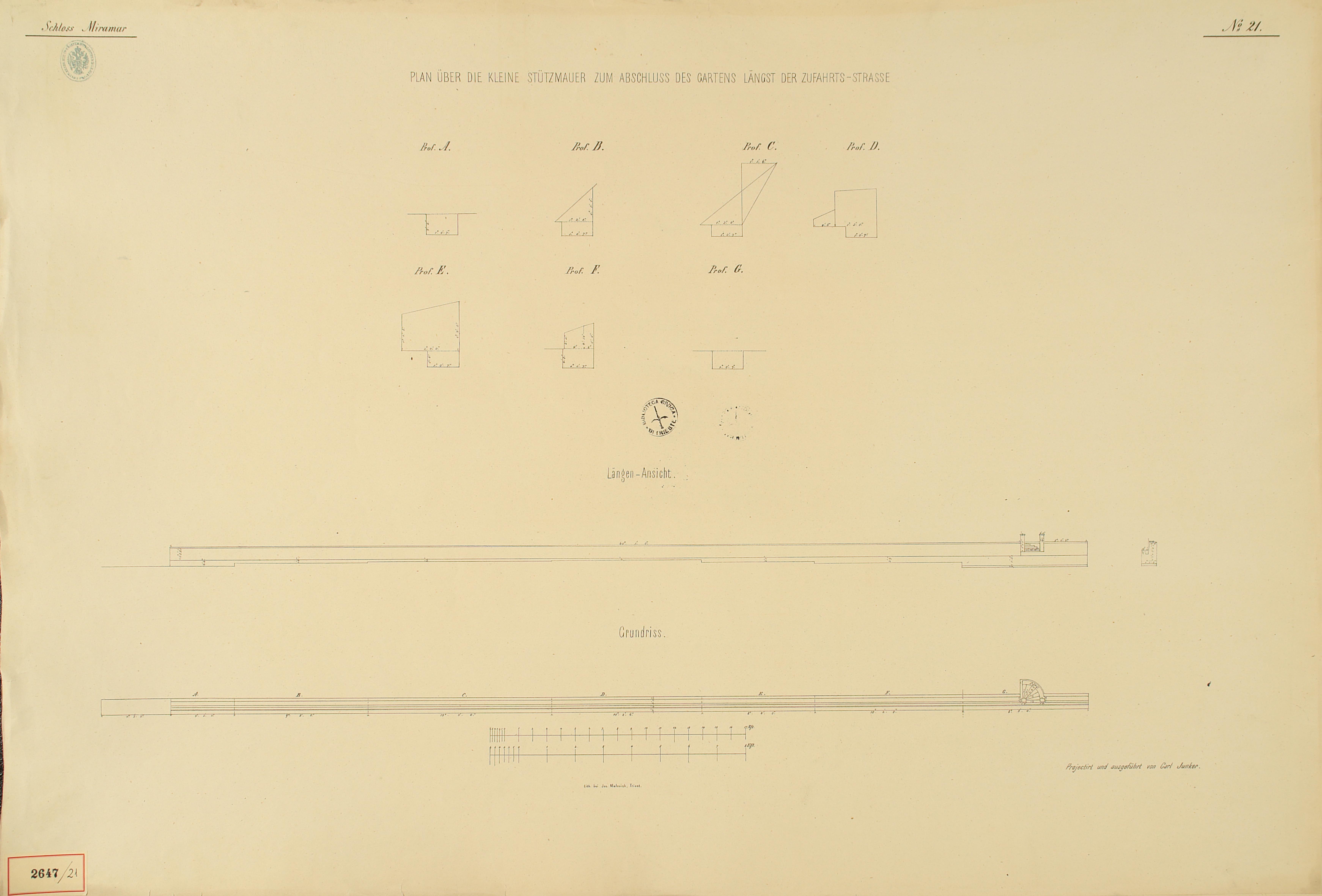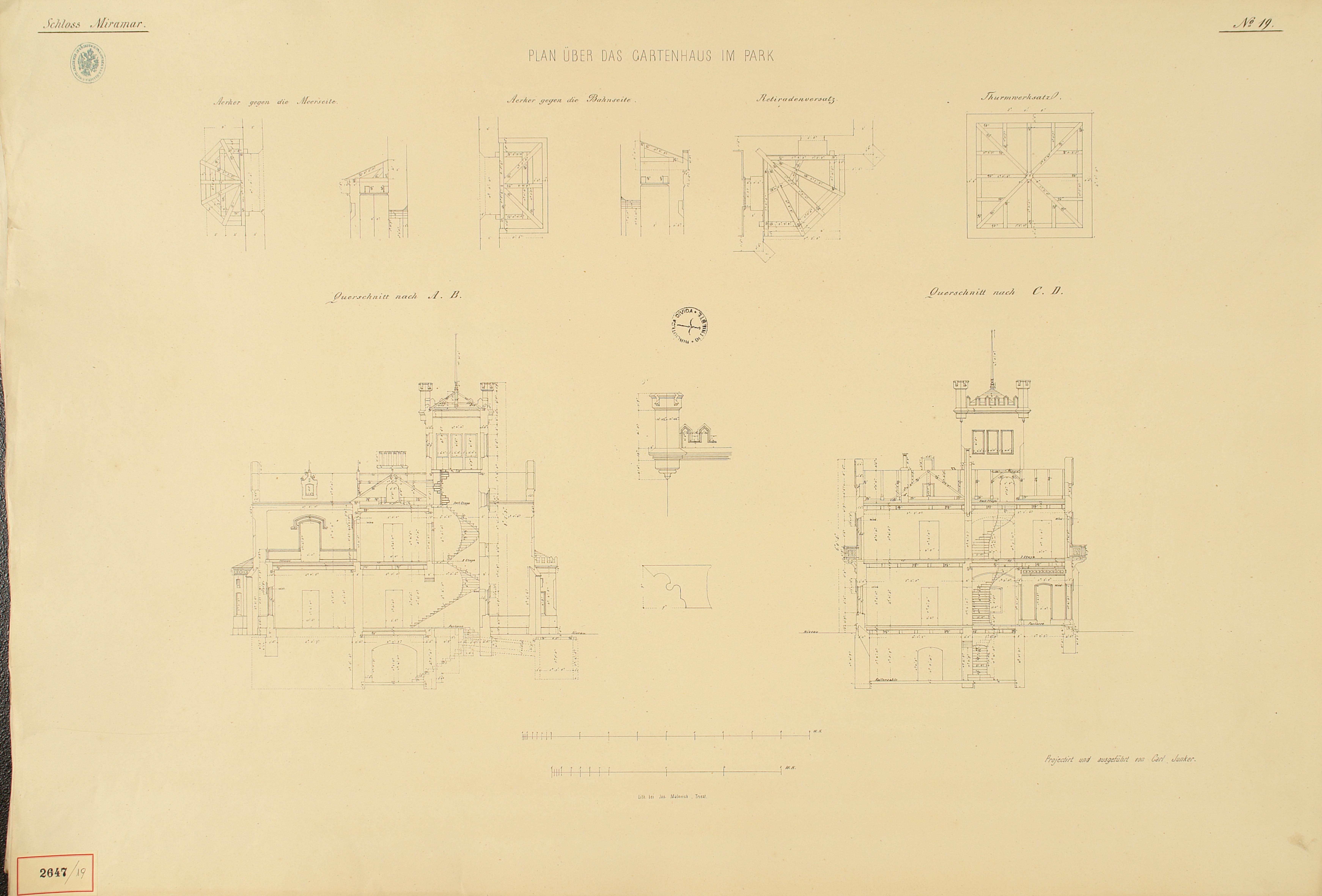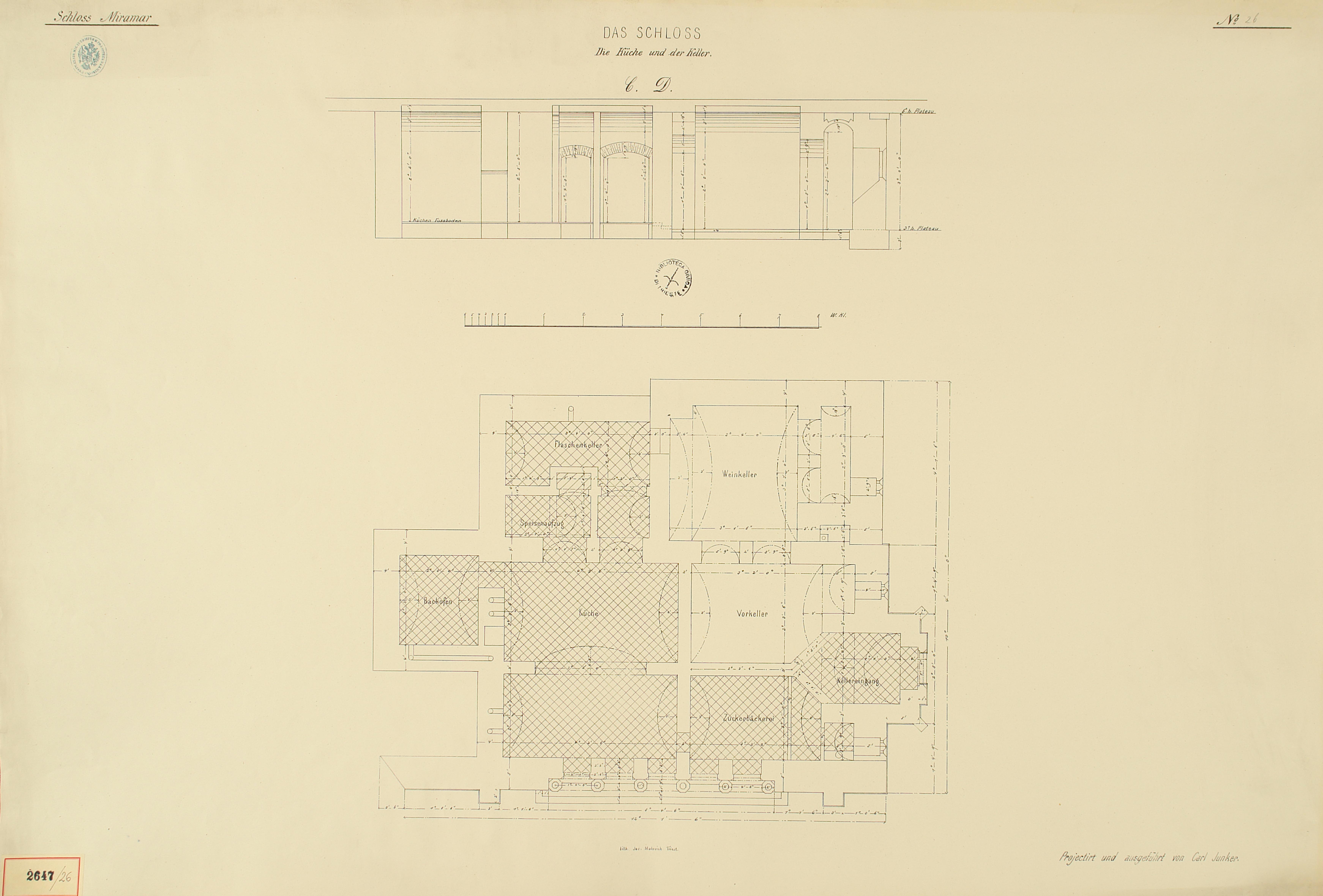 *Schloss Miramar : Im hohen Auftrage seiner k. k. Hoheit des durchlauchtigsten Herrn Erzherzogs Ferdinand Max / Im Zeitraume vom 1. März 1856 bis 27. July 1860, projectirt und ausgeführt von Carl Junker. - Trieste : lith. bei Jos. Malovich, 1856-1860. - 54 tav., 1 pianta e 1 frontespizio : lit. ; 61x90 cm le tav. e 103x142 cm la pianta. ((Tit. della pianta: Situation der Bau- und Garten-Anlagen in Miramar.