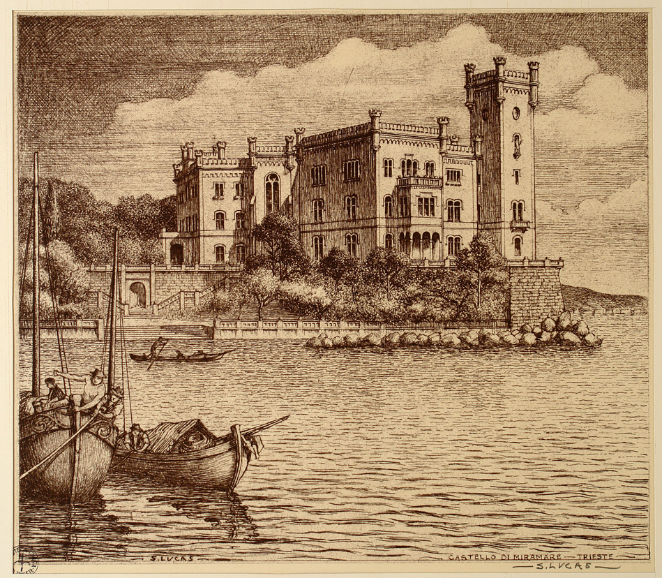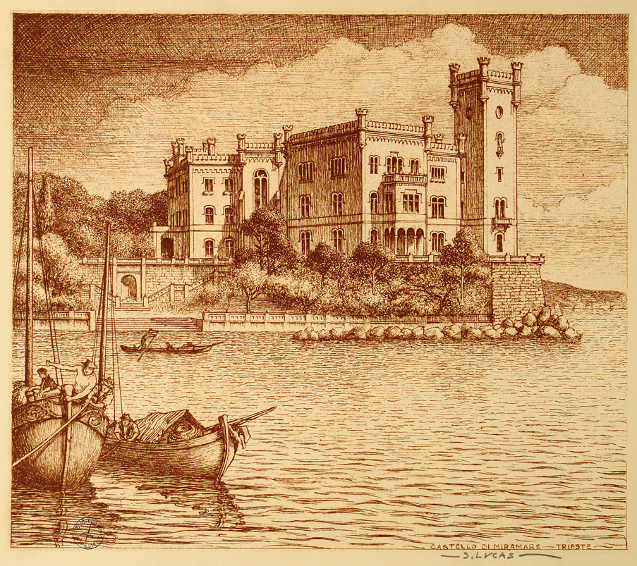 *Castello di Miramare, Trieste / S. Lucas. - [S.l. : s.n., 1950?]. - 1 stampa : lit. ; foglio 335x453 mm.
